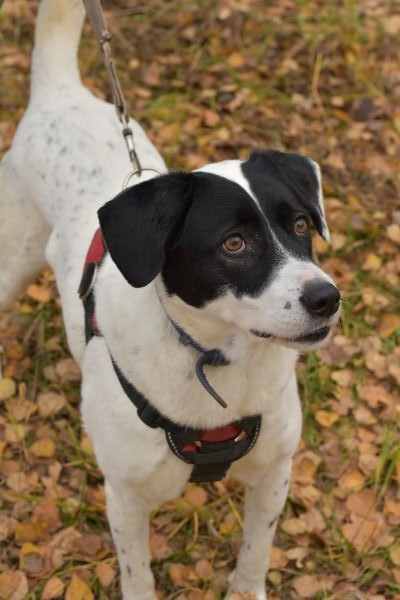 По размеру в холке и телосложению похожа на лабрадора, только поизящней. Окрас бело-чёрный.