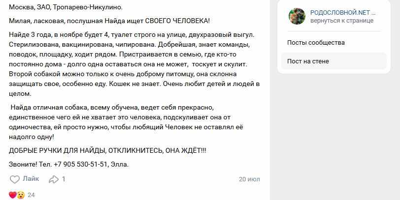 Млювик Posted December 20, 2025 Share Posted December 20, 2025 (edited) Найда в собаках на пристройство в vk https://vk.com/wall-25652332_182449 свежий текст, но старое имя в фонде ДОМ https://fundhome.ru/animal/354 со старой информацией, а я думала Элла её перепишет , но видимо только для нового будет Ная. Отношение к собакам теперь радостное к каждой встречной, только когда пару дней никого не встречали, а так и поигнорировать может, и с рыком подлететь (не пойму толи игра, толи права качает нахалка), на приставучих кобелей часто огрызается. Что-то опять Найда будит меня рано по утрам, уже неделю наверно, причем не то чтоб прям ей в туалет надо.. Найда радуется,когда снег выпадает и плюхается поваляться. из-за того что снег редко, когда слякоть не ходим в лес, уж слишком там темно. в микрорайоне побегать Найде доводится лишь по газонам у дорог или на поляне у школы (там бывает сборище собак). Edited December 20, 2025 by Млювик 1 Link to post Share on other sites