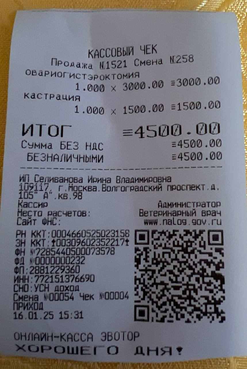 dinakulikova Posted January 15 Author Share Posted January 15 (edited) Пост для ФО Приход: 17.01.25 - 2000 рублей от CrissCross 17.01.25 - 500 рублей от Наташа М. 17.01.25 - 5000 рублей от Дикий Барсик 27.02.25 - 10000 рублей от quio Итого: 17500 рублей Расход: 7.01.25 - 4165 рублей за анализы 16.01.25 - 4500 рублей стерилизация Миланы и Леопольда 27.01.25 - 1000 за пиар на сайте Всем по кошке 10.04.25 - 1000 рублей взнос на WOОW 01.05.25 - 1500 рублей справка на WOОW Итого: 12165 рублей Итого на 10.04.25 5335 рублей Edited May 1 by dinakulikova Link to post Share on other sites